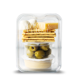 - Hummus (Cooked Chickpeas [Chickpeas, Water], Tahini [Ground Sesame], Water, Canola Oil, Less Than 2%: Natural Flavors, Sea Salt, Dried Roasted Garlic, Citric Acid, Spice), Parmesan Cheese (Cultured Milk, Salt, Enzymes), Mozzarella Pearls (Pasteurized Milk, Vinegar, Enzymes, Salt), Everything & More Crackers (Enriched Unbleached Flour [Wheat Flour, Malted Barley Flour, Niacin, Reduced Iron, Thiamin Mononitrate, Riboflavin, Folic Acid], Buttermilk (Cultured Low-fat Milk, Salt, Sodium Citrate), Expeller Pressed Non-GMO Canola Oil and/or Sunflower Oil, Extra Virgin Olive Oil, Whole Grain Flour (Wheat Flour, Dark Rye Flour, Amaranth Flour, Quinoa Flour), Sesame Seeds, Sea Salt, Onion Juice, Chia Seeds, Poppy Seeds, Flaxseeds, Baking Soda, Roasted Garlic, Caraway Seeds), Lemon & Garlic Olives (Green Olives, Garlic Powder, Lemon Juice, Sea Salt, Citric Acid [acidity regulator])